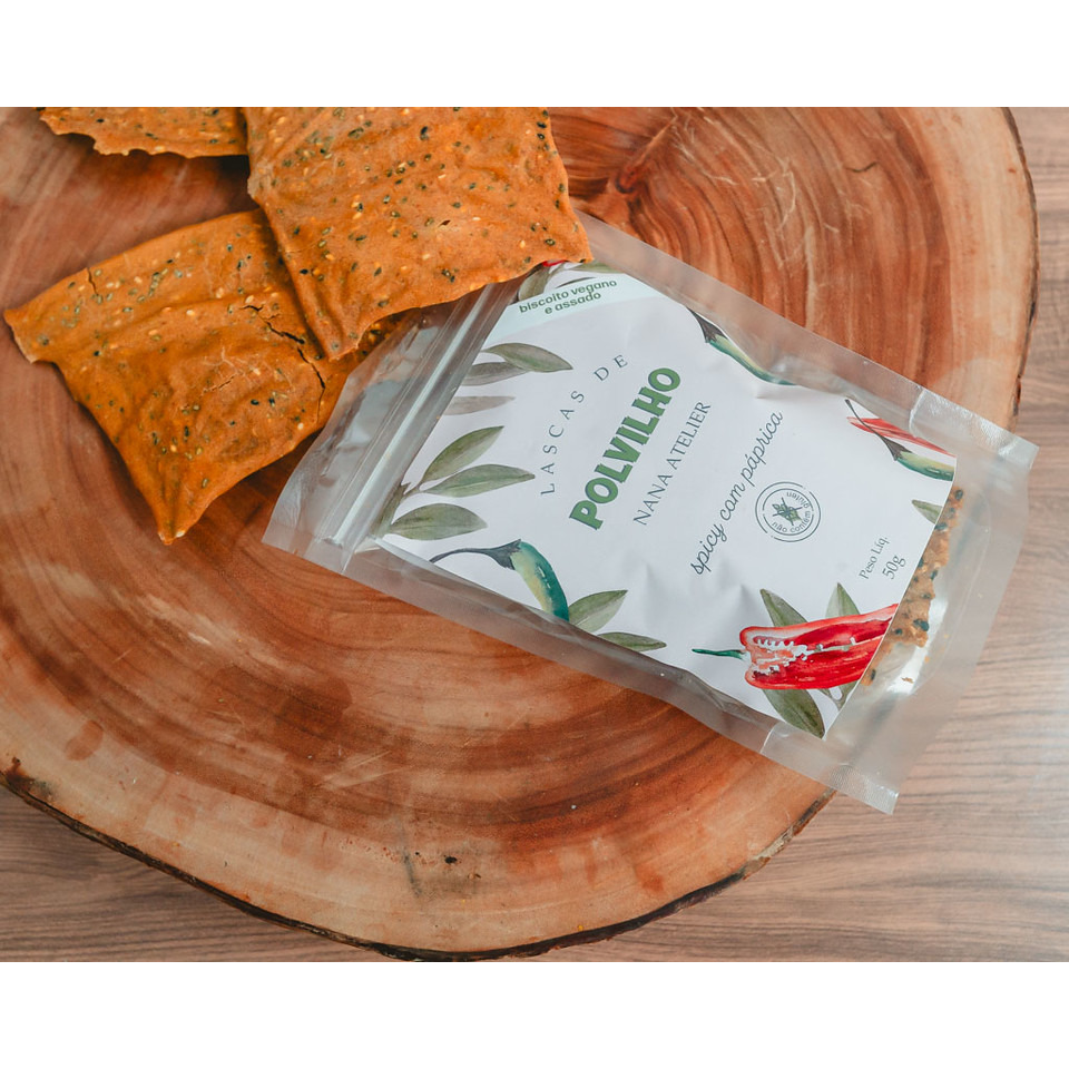 Lascas de Polvilho super crocantes e com um sabor levemente picante, spicy com páprica, Uma ótima opção para ter sempre na bolsa, servir de aperitivo e até comer com ovos mexidos no café da manhã. Pacote com 50g. VEGANO, ZERO LÁCTEOS E ZERO GLÚTEN.