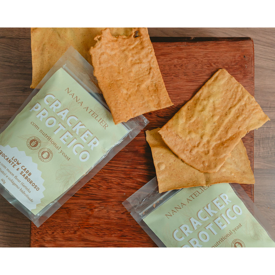 Para aqueles que amam nutritional yeast, o nosso cracker proteico e low carb é feito com colágeno, moon protein flour (farinha proteica zero carbo – proteína orgânica do arroz) e muuuuito nutritional. Bem crocante e saboroso é um excelente snack proteico (24g de proteína no pacote) para ter na bolsa sempre. Pacote com 60g. LOW CARB, ZERO LÁCTEOS E ZERO GLÚTEN.