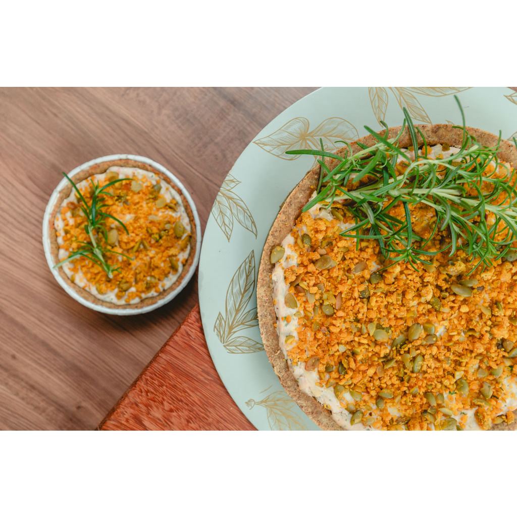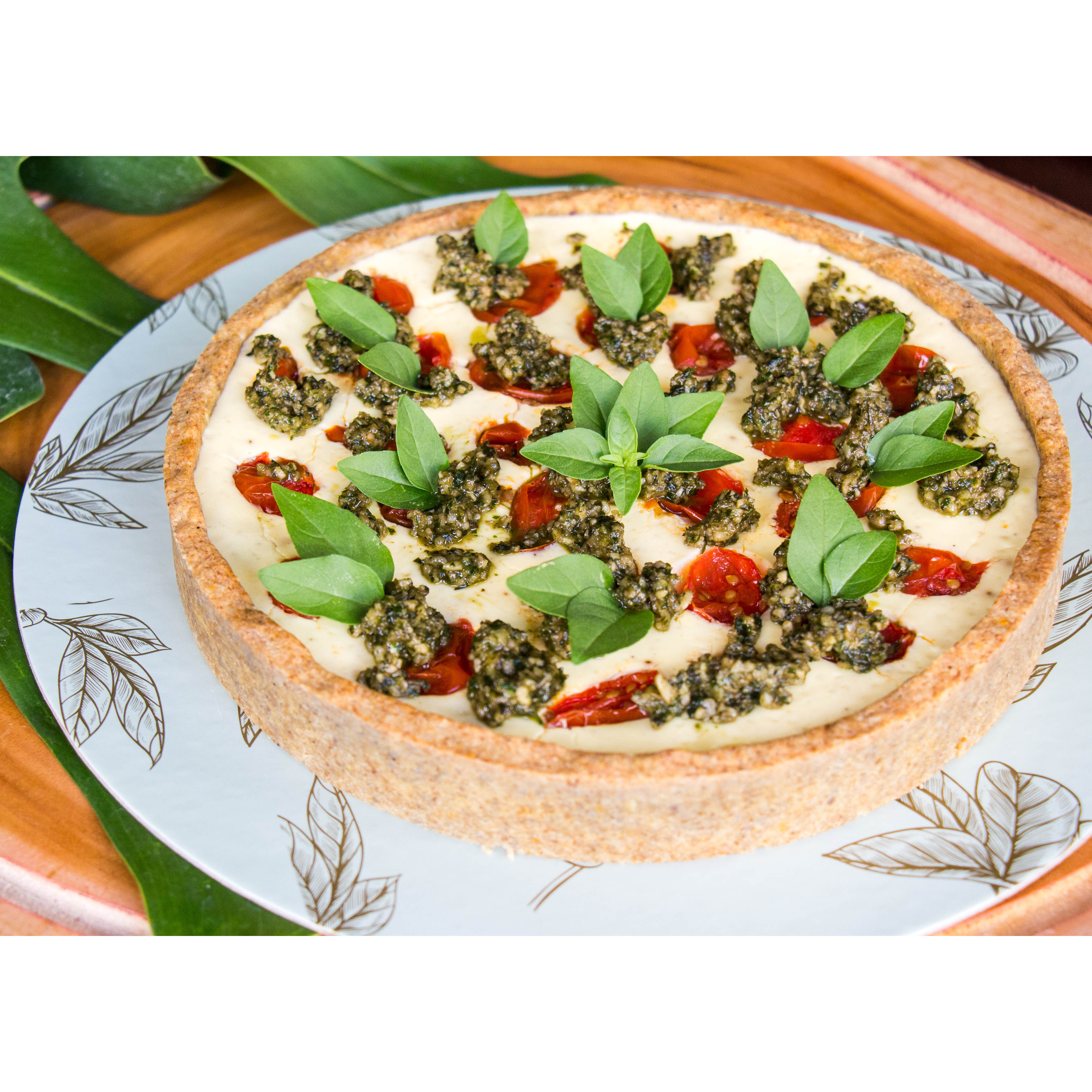 A versão vegana da Quiche Rita, mas que surpreende qualquer amante de um queijinho, pode acreditar! Com a massa low carb de grão de bico, farinha de amêndoas e farinha de girassol, o recheio é extremamente cremoso e saboroso. Como qualquer caprese, não pode faltar os tomatinhos, aqui na versão tomatinho sweet assado e pesto de sementes. LOW CARB, VEGANA (ZERO LÁCTEOS) E ZERO GLÚTEN
