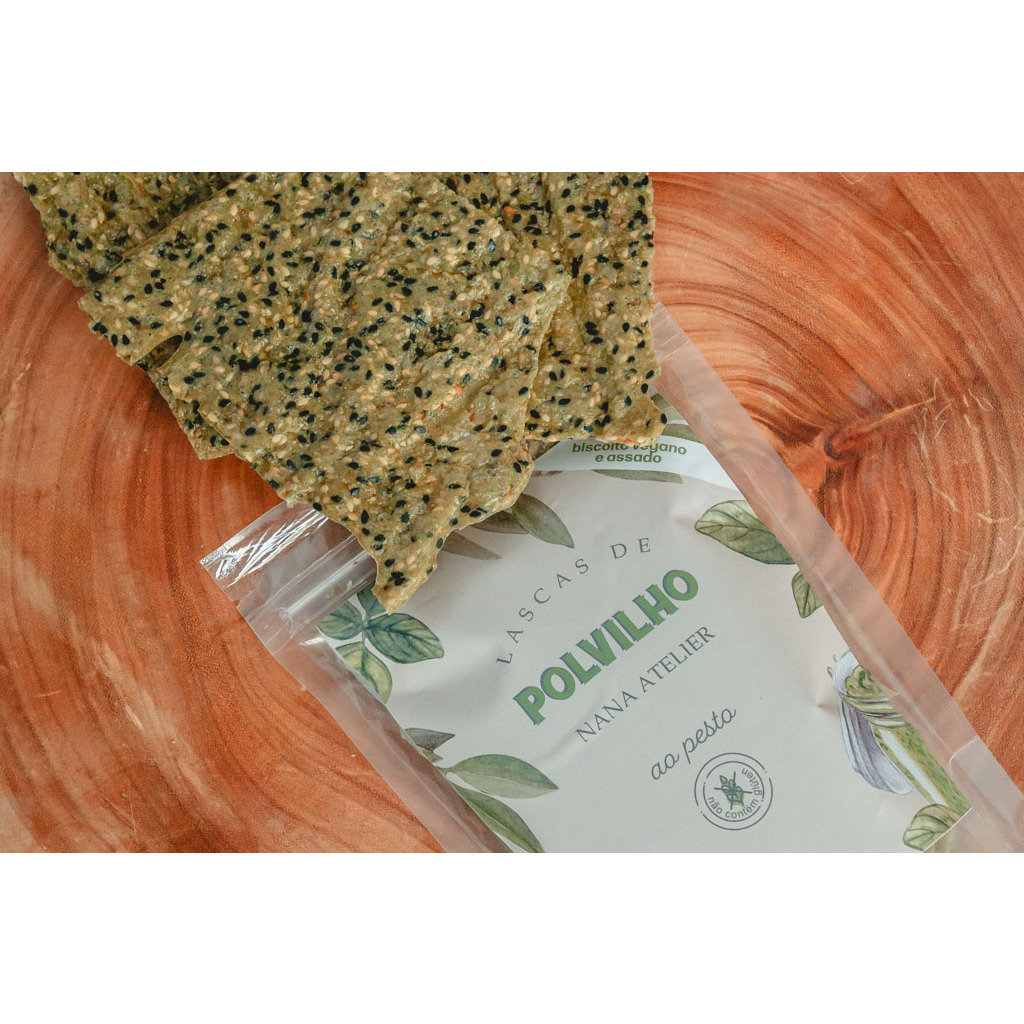 Lascas de Polvilho super crocantes e com um sabor especial: pesto de sementes artesanal feito em nossa produção, com manjericão da nossa horta. Uma ótima opção para ter sempre na bolsa, servir de aperitivo e até fazer parte do lanchinho das crianças. Pacote com 50g. VEGANO, ZERO LÁCTEOS E ZERO GLÚTEN.