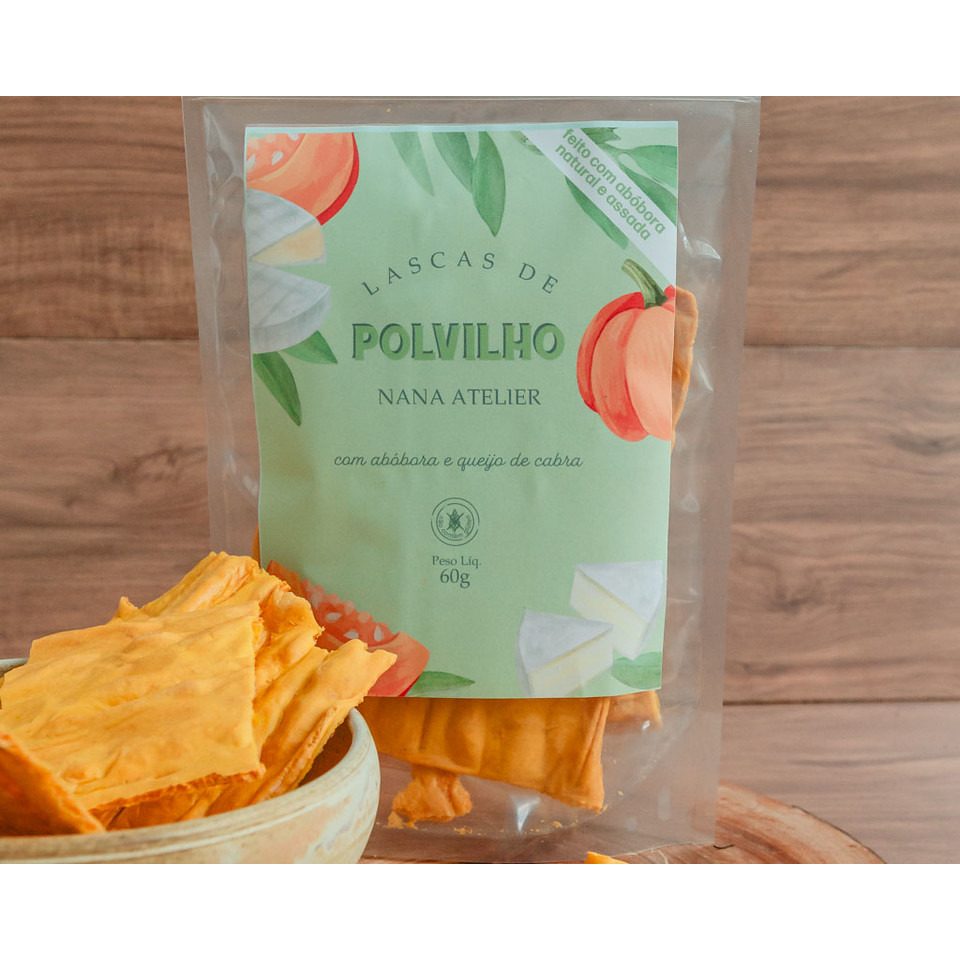 Nossas lascas de polvilho de abóbora com queijo de cabra são feitas com abóbora natural assada, azeite de oliva, queijo e leite de cabra. Além de super crocantes, são saborosas e uma ótima opção para servir de aperitivo e até fazer parte do lanchinho das crianças. Pacote com 60g. ZERO GLÚTEN, CONTÉM LACTOSE E CASEÍNA