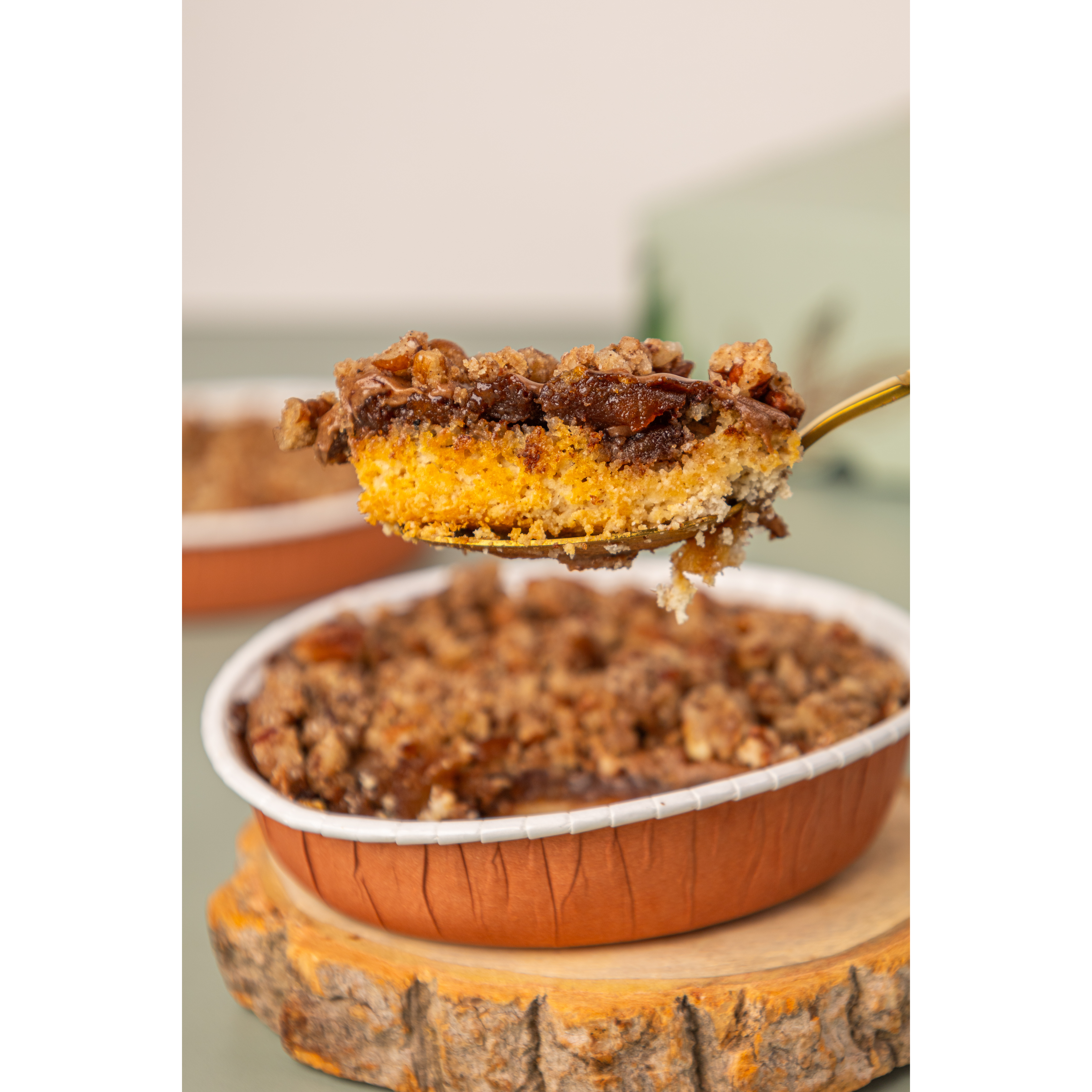 Aquele doce de só sentir o cheirinho deixa qualquer um com desejo de experimentar! Com uma massinha de amêndoas, a nossa cuca é bem molhadinha, feita com maçã caramelizada com canela, especiarias e moon syrup (“maple” sem açúcar e poliól), creme de brigadeiro de canela com tofu orgânico e para finalizar, o nosso delicioso crumble de noz pecan com amêndoas e canela. LOW CARB, VEGANA (ZERO LÁCTEOS), ZERO GLÚTEN, AÇÚCAR E POLIÓL.